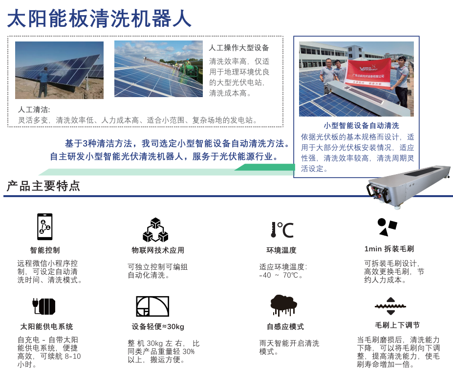 - 全球都(dōu)在用(yòng)太陽能(néng)闆清洗機(jī)器(qì)人(rén),MULTIFIT國(guó)際品牌 (股權代碼:280768σ)我司有(yǒu)著(zhe)優秀的(de)研究團隊,公司資金(jīn)雄厚,秉承“二變三創新應用(yòng)理(lǐ)論”,将創新思維與創新能(néng)力應用(yòng)于新産品開(kāi)發實踐之中,以創新實踐的(de)方式探索綠(lǜ)色社會(huì)、零排放(fàng)社會(huì)的(de)可↔(kě)能(néng)性。